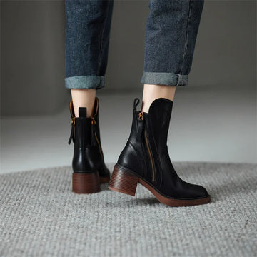 A sleek, luxurious leather finish with a round toe and stacked block heel define these boots containing double side zippers for easy wear, ideal for your cool-weather looks.